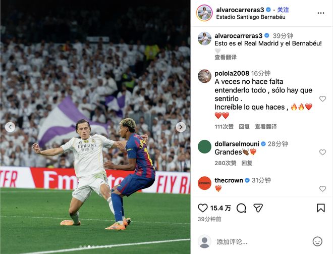 雷速体育10月27日讯 在今日凌晨结束的西班牙国家德比中,皇马主场2-1战胜巴萨,将积分榜的优势扩大至5分。赛后,皇马左后卫卡雷拉斯(A费)在社媒中晒出自己防守亚马尔的照片,并配文,“这里是伯纳乌,这就是皇马。”